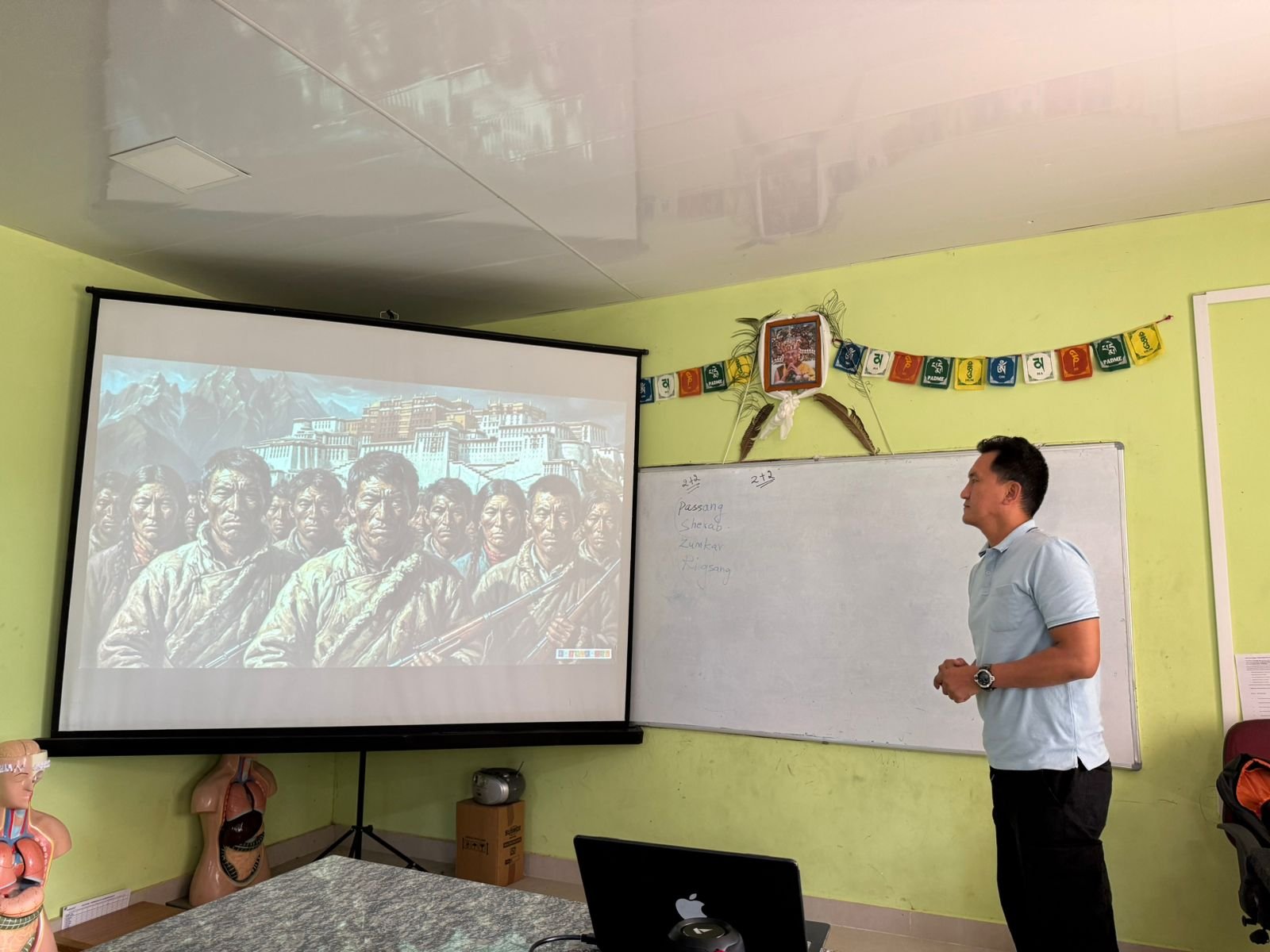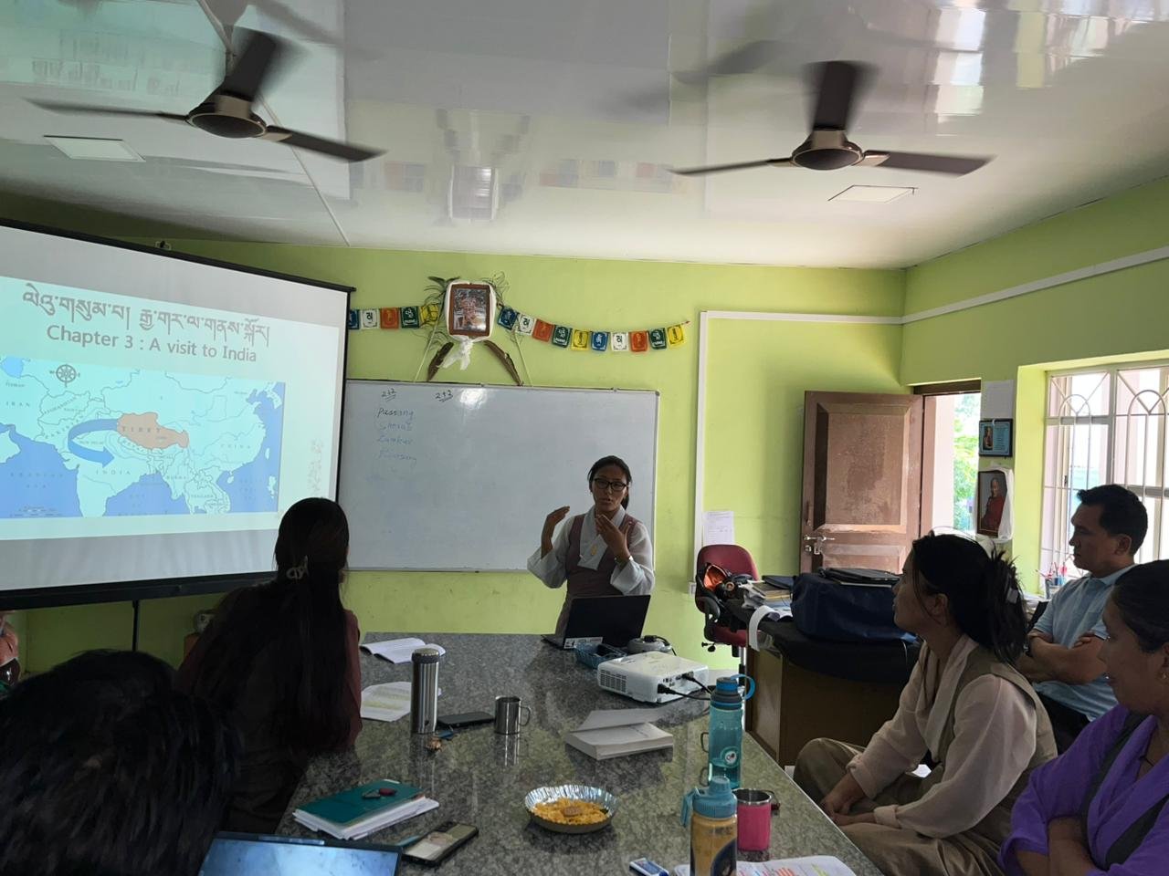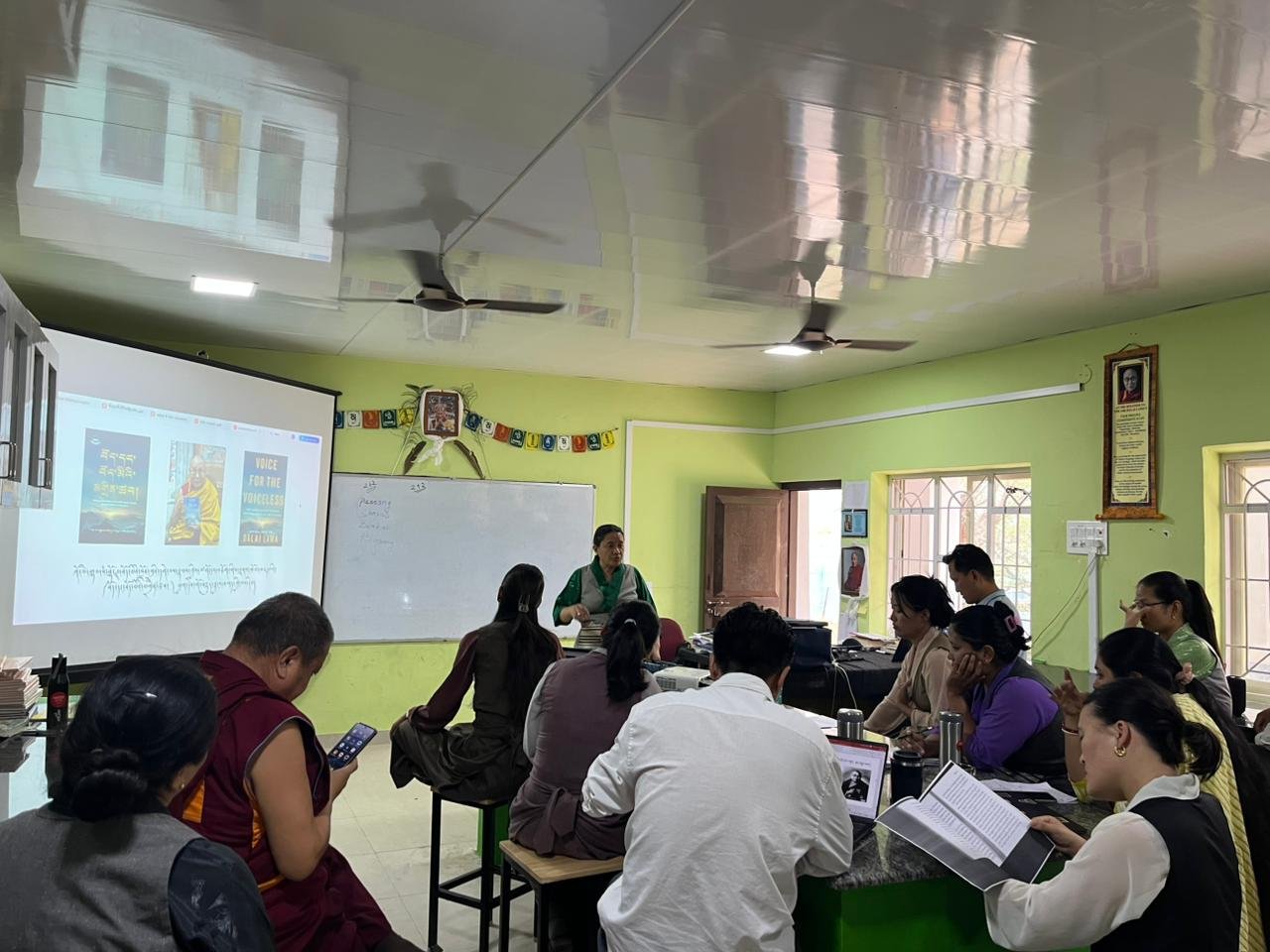 ༸སྐུའི་གོ་སྟོན་སྲུང་བརྩི་དང་སྦྲགས། འདི་སློབ་ཀྱི་གོ་སྟོན་ཚོགས་ཆུང་གིས་གོ་སྒྲིག་འོག་འདི་ཟླའི་ཕྱི་ཚེས་ ༢༨ ཉིན་འདི་གའི་སློབ་གྲྭའི་དགེ་ལས་རྣམས་ནས་༸གོང་ས་མཆོག་གིས་ལྗགས་རྩོམ་མཛད་པའི་ཕྱག་དེབ་༼བོད་དང་བོད་མིའི་མགྲིན་ཚབ།) སྐོར་ལ་གོ་བསྡུར་སྦྱངས་བཤད་གནང་སྐབས་ཀྱི་བརྙན་པར།